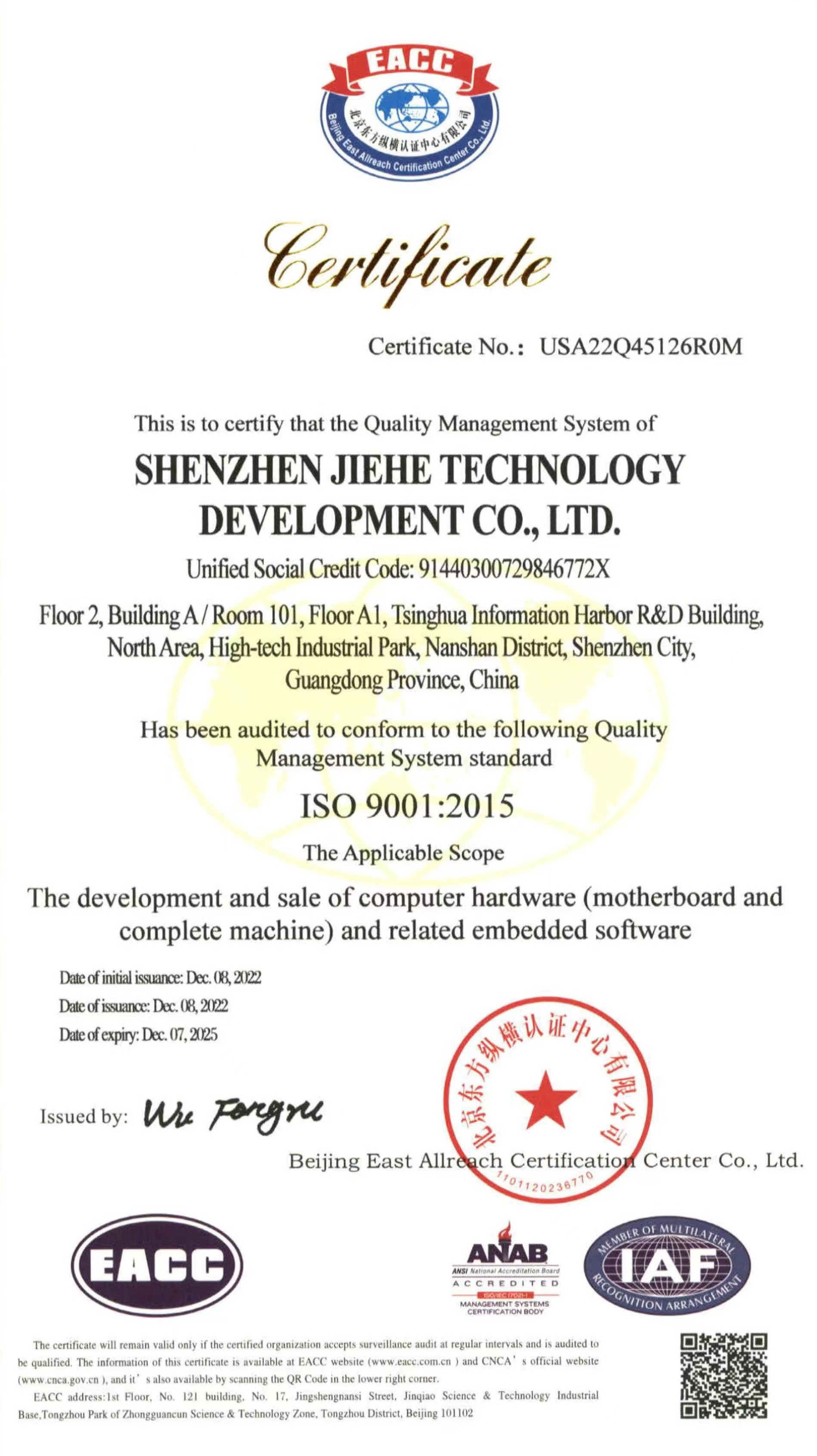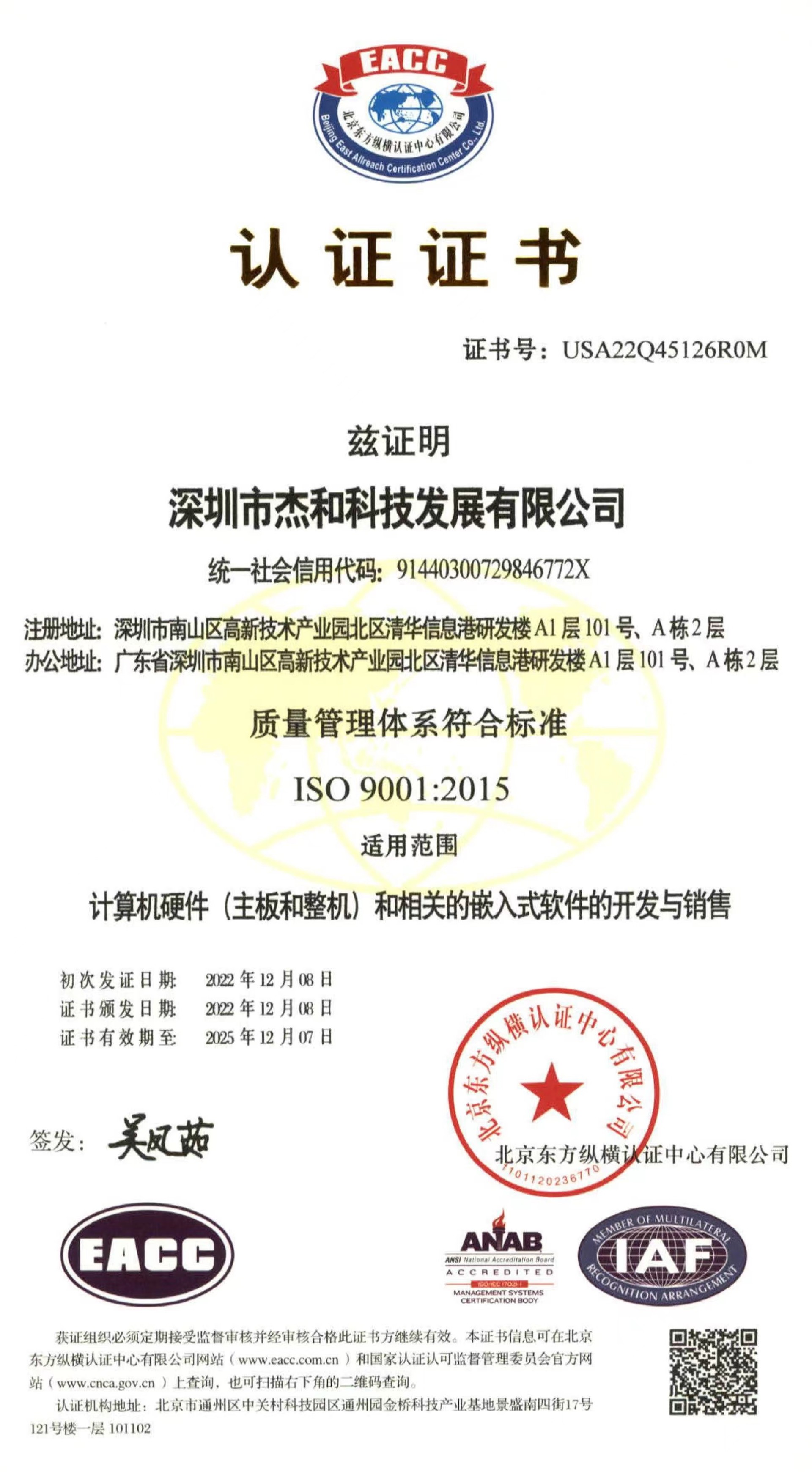ISO9001质量管理体系认证作为国际标准化组织的管理性质标杆,它的地位可见一斑,其认可彰显了CA88(中国)科技的体系管理以及产品的质量。CA88(中国)科技在过去几年不断提升设备标准化生产的能力,减少人为质量问题,把ISO9001质量管理体系理念贯穿于产品研发—生产全流程。