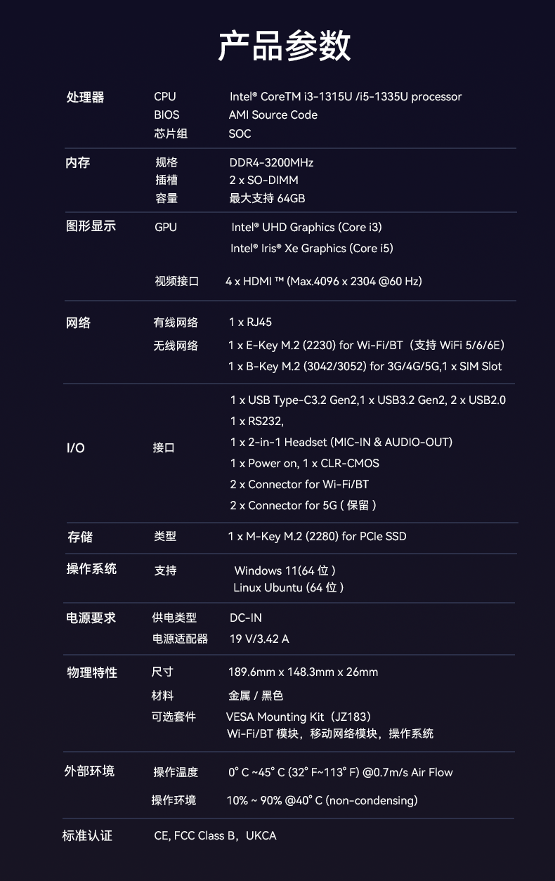 CA88(中国)科技D613采用英特尔Raptor Lake酷睿i3-1315U/i5-1335U 处理器,作为一款性能强悍的主机,它的TDP仅15W,能有效降低能耗,延长电池寿命。在内存方面,D613采用2 x SO-DIMM DDR4-3200 MHz,最大可达64GB,并配备1 x M-Key M.2 (2280) for PCIe SSD。