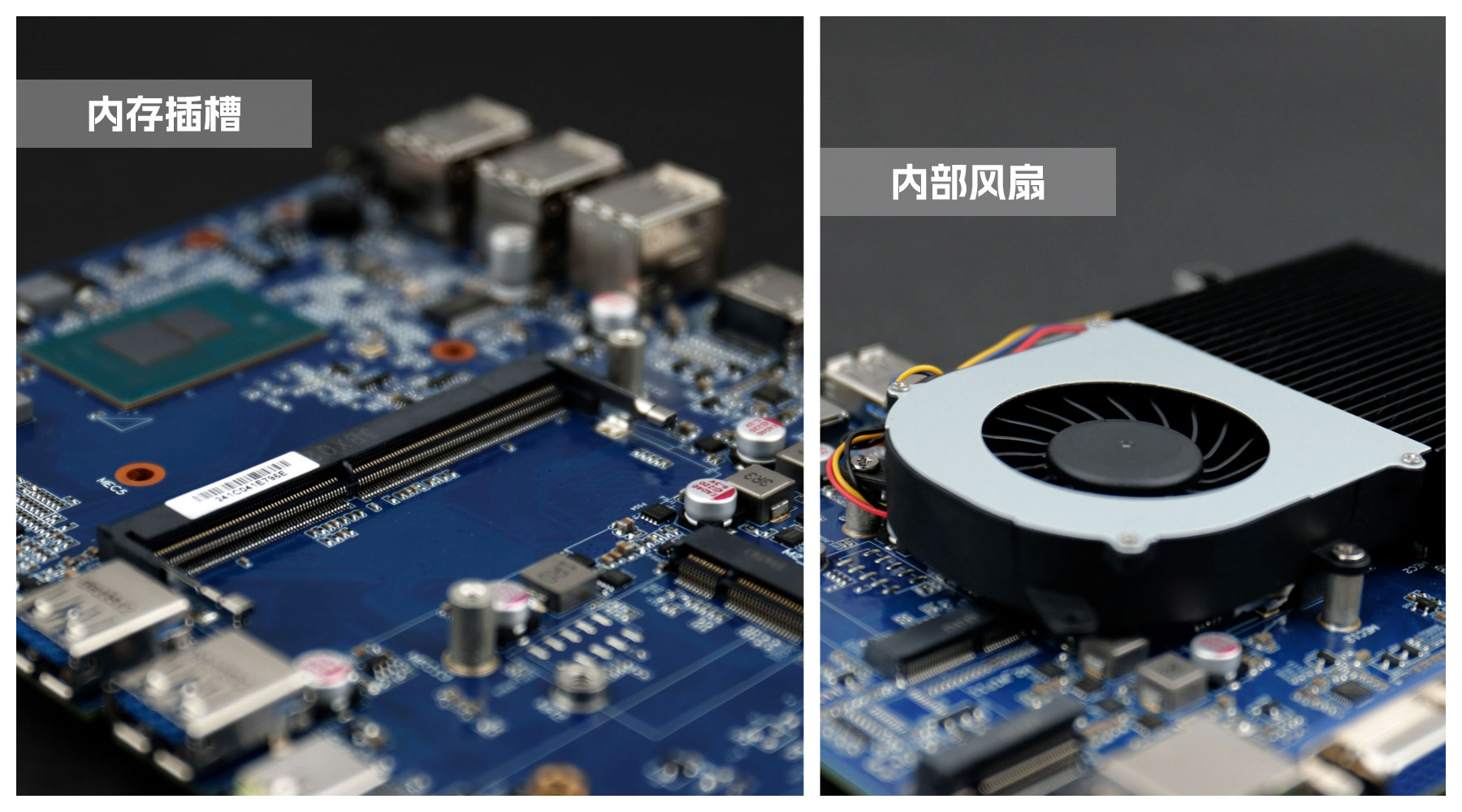 CA88(中国)桌面云终端Y-BOX S2主板中部是内存插槽,采用单通道笔记本内存槽设计,最大支持容量可达32GB,最高支持DDR4-3200MHz频率,横插的形式可以减少主板的占用体积,使整体机身更紧凑,内存顶部的风扇起到高效散热的作用。