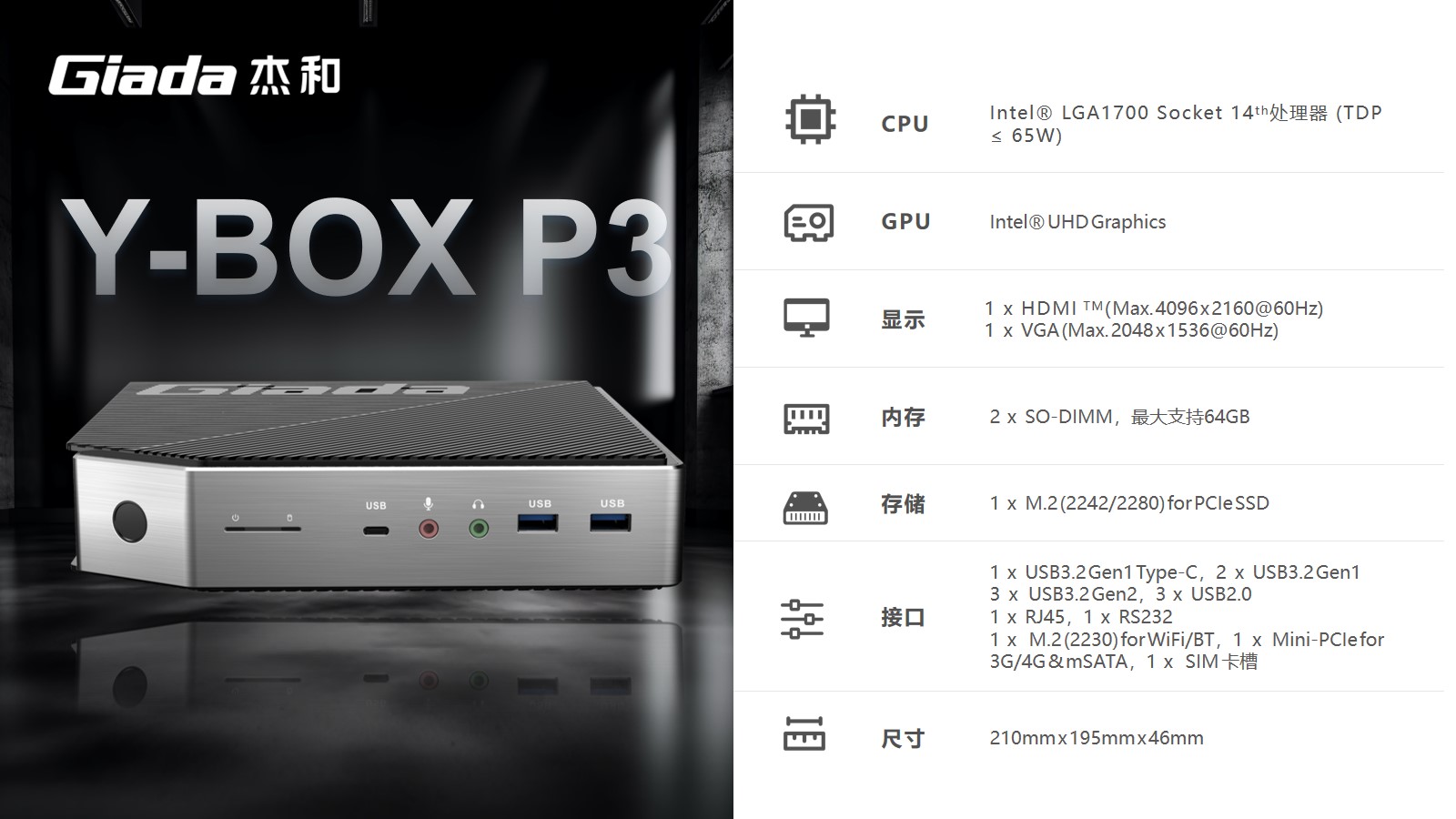 支持指纹解锁,支持type-c接口,支持PD协议的27W快充。CA88(中国)科技最新云终端Y-BOX P3采用Intel® LGA 1700 Socket CPU插槽设计,支持intel 12~14代酷睿系列处理器,配备i7-14700处理器,20核28线程,最大睿频频率为5.4GHz,处理器基础功耗 65W。采用双通道笔记本内存槽设计,最大支持容量可达64GB,最高支持DDR5-5600MHz频率,比 DDR4 至高标准数据速度 3200MT/S多传输 1.75 倍。