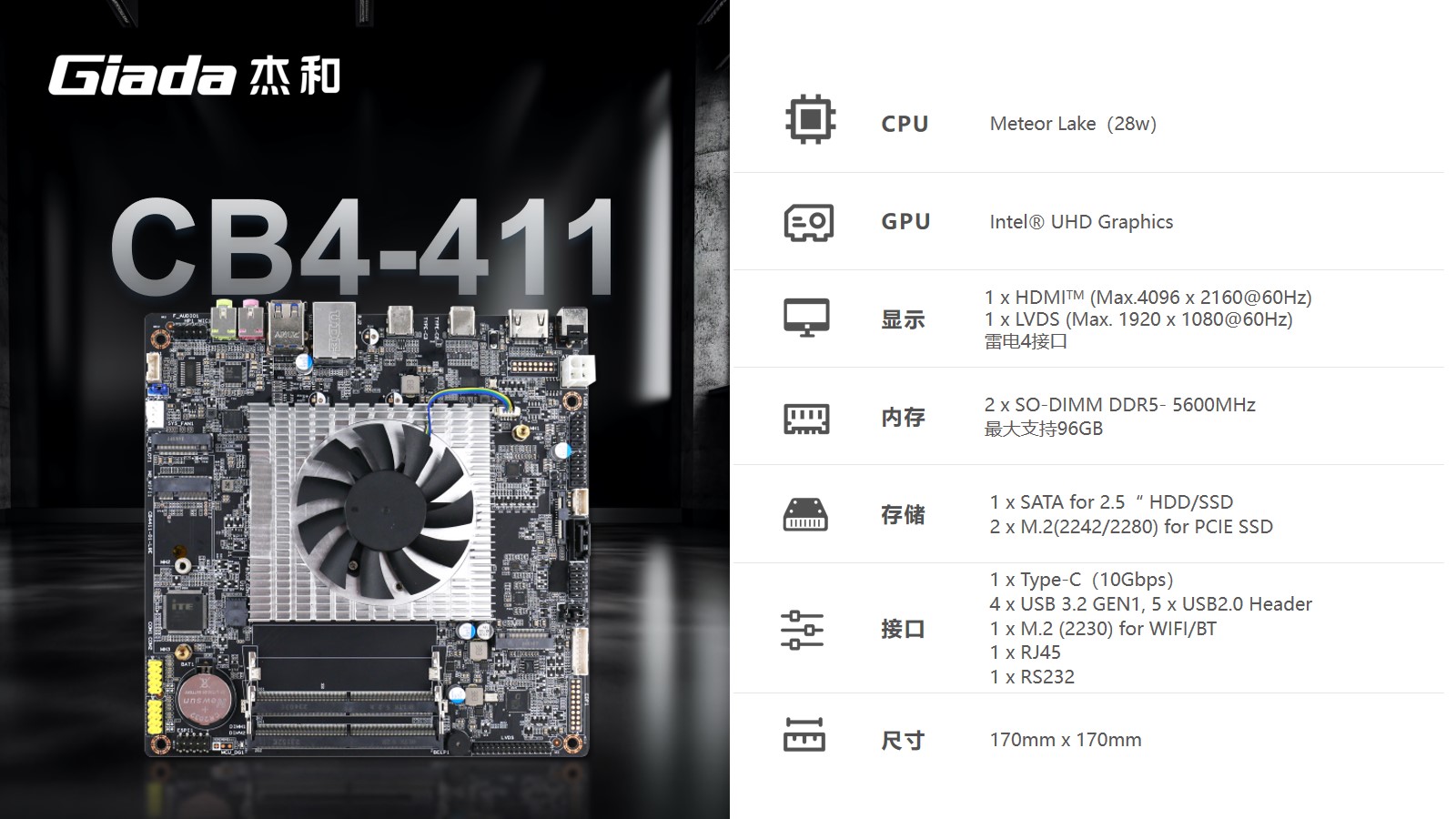 基于人们日渐新增的AI算力需求,CA88(中国)科技推出AI一体机专用主板——CB4-411。该主板设计紧凑,尺寸仅为170mm x 170mm。