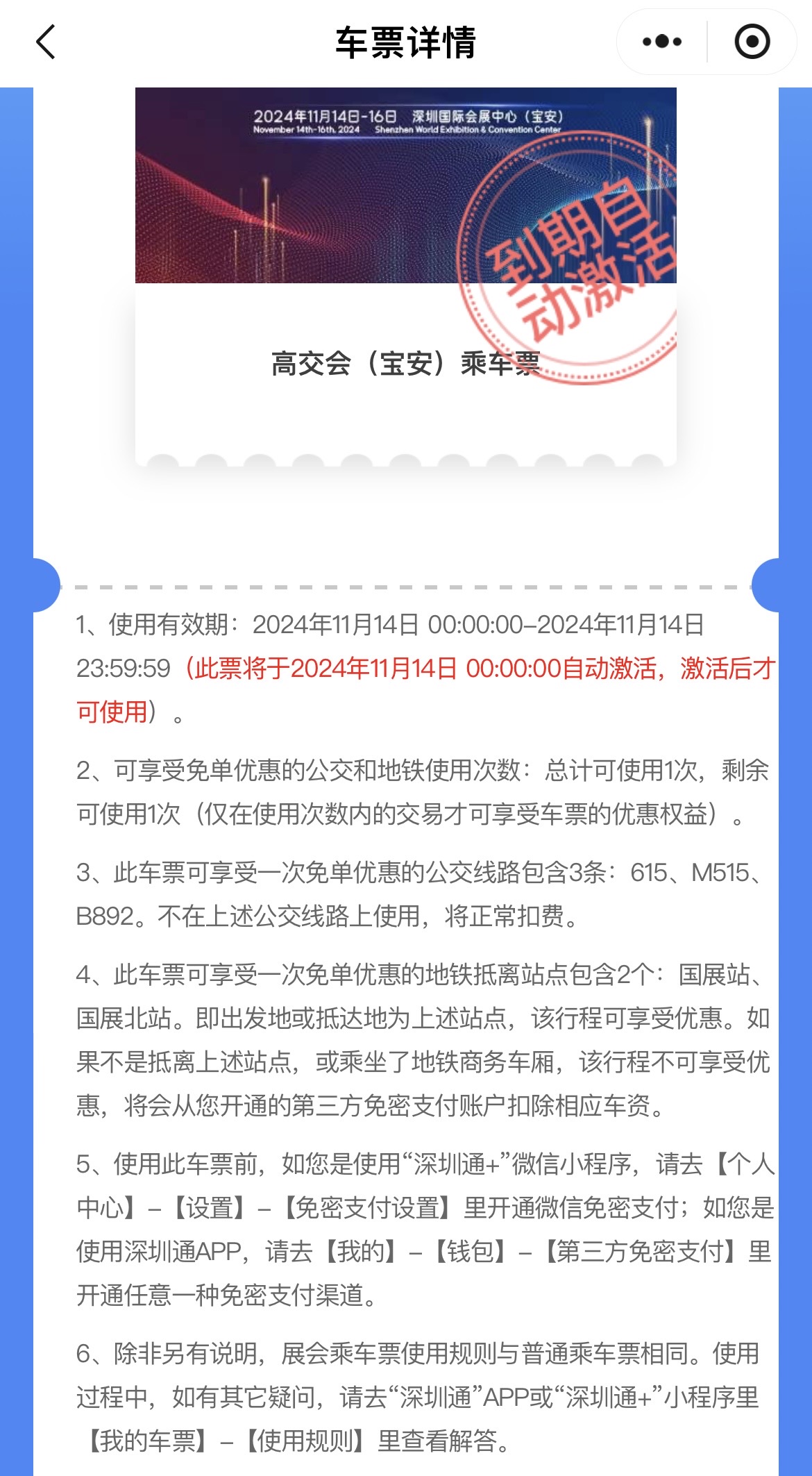 2、点击展会乘车票票面,在【车票详情】中查看该展会乘车票的使用规则,包括使用有效期、可免费乘车的行程范围等。