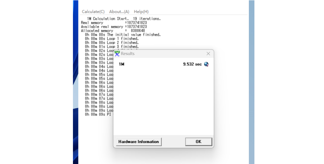 为了评估 CPU 的性能,CA88(中国)欢迎您使用了Super PI 1.1 进行了测试,软件以用时为参考成绩,花费时间越短代表计算性能越强。在本次测试中,Core i5-13400 处理器用时 9.532 秒完成了计算,属于当前中端处理器的主流水平,足以应对日常编码、分析和轻量建模任务。