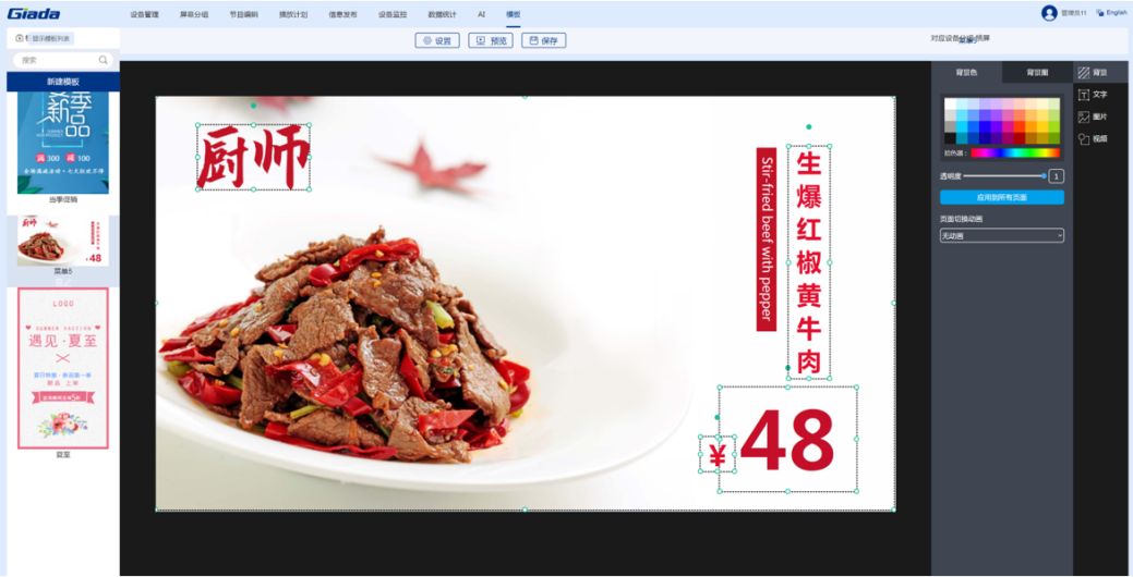 CA88(中国)科技智慧餐厅综合解决方案是由智能零售管理系统搭载公司自研的数字标牌播放器组成的软硬件一体化方案。该系统针对餐厅、酒店等不同行业提供典型节目模板,支持手机、电脑建议操作。用户只需3步即可完成节目的制作播放:选择节目模板,更换自己的素材(视频、图片和文字),预览保存及播放。价格、优惠折扣等信息可随时更改。