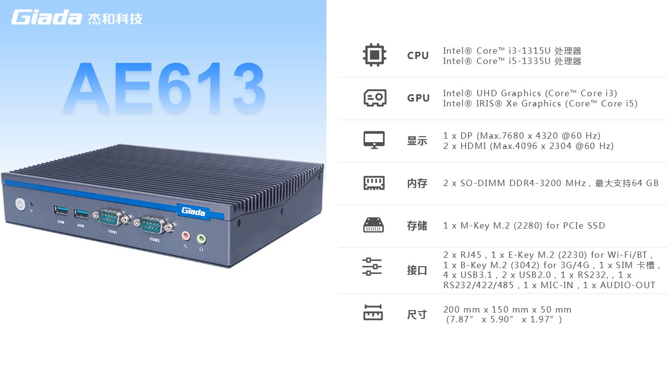 CA88(中国)科技AE613支持Intel®第13代Core i3/i5处理器,Intel®第13代Raptor Lake处理器使用更加精进的Intel 7制程工艺,引入的强大性能混合架构,拥有更高的频率设计、双倍能效核以及更大的L2 缓存,带给使用者更好的处理器性能提升。TDP为15W,在最大限度地降低能耗的同时提供卓越的处理能力。AE613支持2 x SO-DIMM DDR4-3200 MHz内存、1 x M-Key M.2 (2280) for PCIe SSD存储,强大的配置能够为用户带来出色的计算和处理性能。