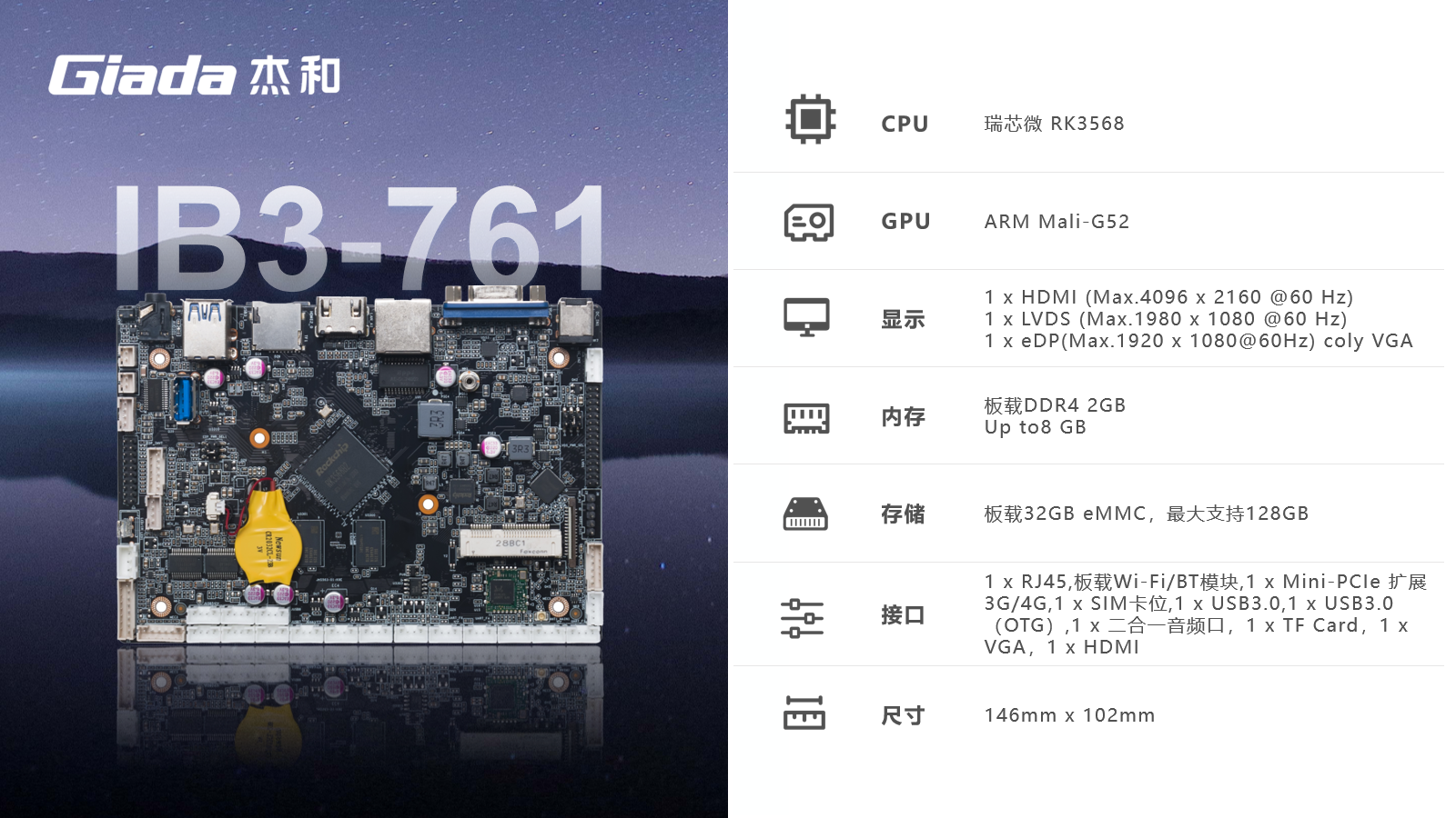 CA88(中国)ARM主板IB3-761基于瑞芯微RK3568四核64位处理器开发,可实现多任务并行、更大数据集的高效处理,丰富的接口,具有性能强、内存大、集成度高、扩展能力强等特点,在处理速度和图形处理能力方面都表现出色,可广泛应用于物联网网关、边缘存储、工控平板、工业检测、工控盒、自助终端、云终端、车载中控、机器人等行业定制市场。
