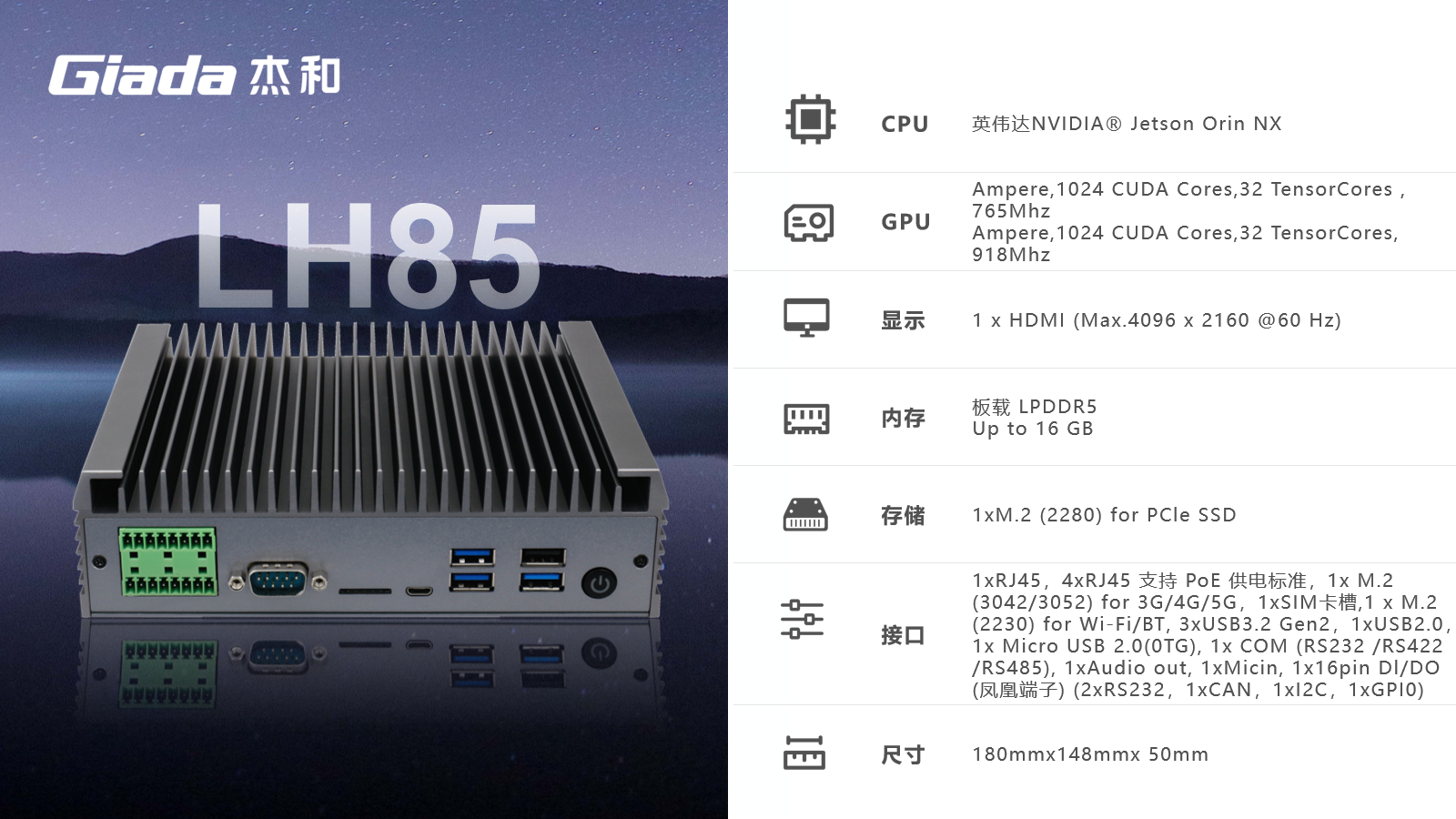CA88(中国)边缘计算产品LH85基于NVidia® Jetson Orin NX套件方案开发,100TOPS超强算力,具备强大的接口配套能力,是全新推出的一代针对边缘计算的创新产品,定位于为工业控制领域客户的AI应用提供强大的算力支持和充足的通信、控制接口保障,可广泛应用于智能制造、机器视觉、AGV、智慧城市等领域。
