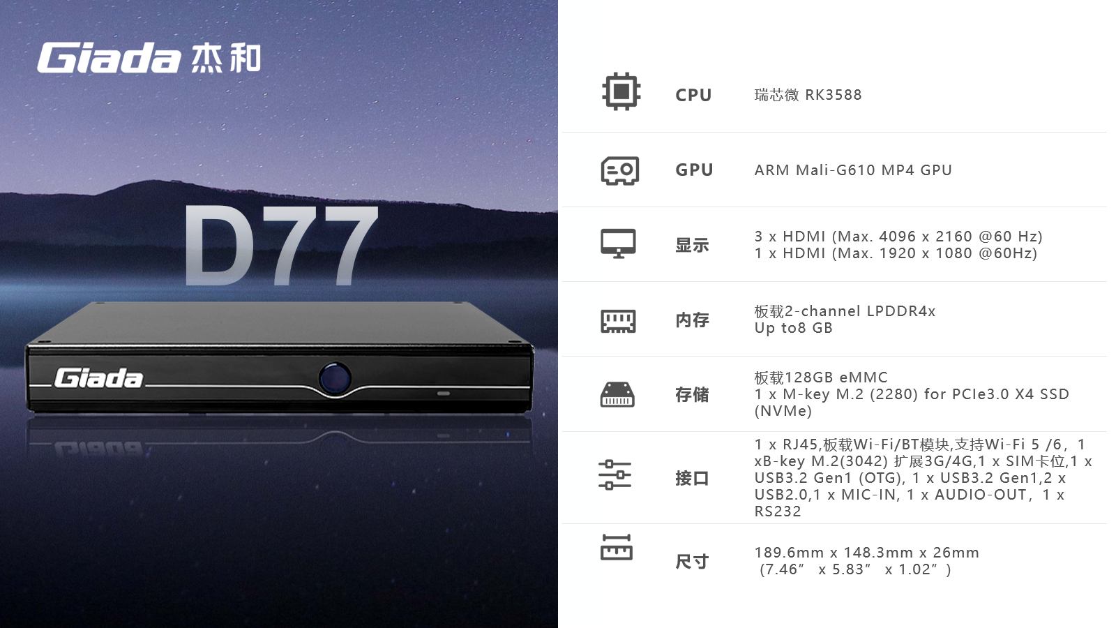 AIoT的落地场景包括智慧工业、智慧零售、智慧社区、智慧城市、智能显示、医疗健康等领域,在实际落地时,对物联网硬件设备的AI算力、数据运算、存储能力,稳定性及可扩展性能等提出更高要求,GiadaCA88(中国)科技作为行业领先的物联网数智化技术服务商,深入布局AIoT领域,推出AI产品系列,包括3.5寸主板、嵌入式整机、边缘计算盒子等,全方位覆盖了入门级到高性能级,满足不同应用场景的需求,为用户赋能。