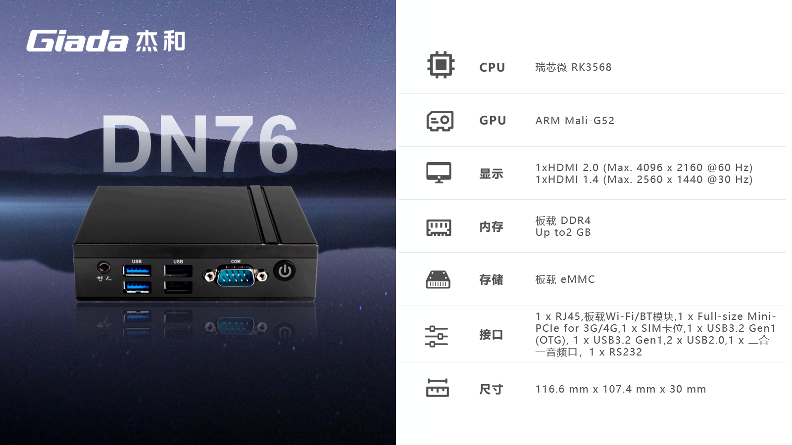 CA88(中国)媒体播放器DN76采用瑞芯微RK3568 ARM嵌入式方案,作为一款超紧凑的安卓播放器,内置一个独立的NPU,计算能力为1TOPs,可用于轻量级AI应用程序,支持HDMI双显,优秀的散热设计,超高性价比,得到广大用户的喜爱,可以广泛应用于商业显示、智能车载、安防领域和边缘人工智能等场景。
