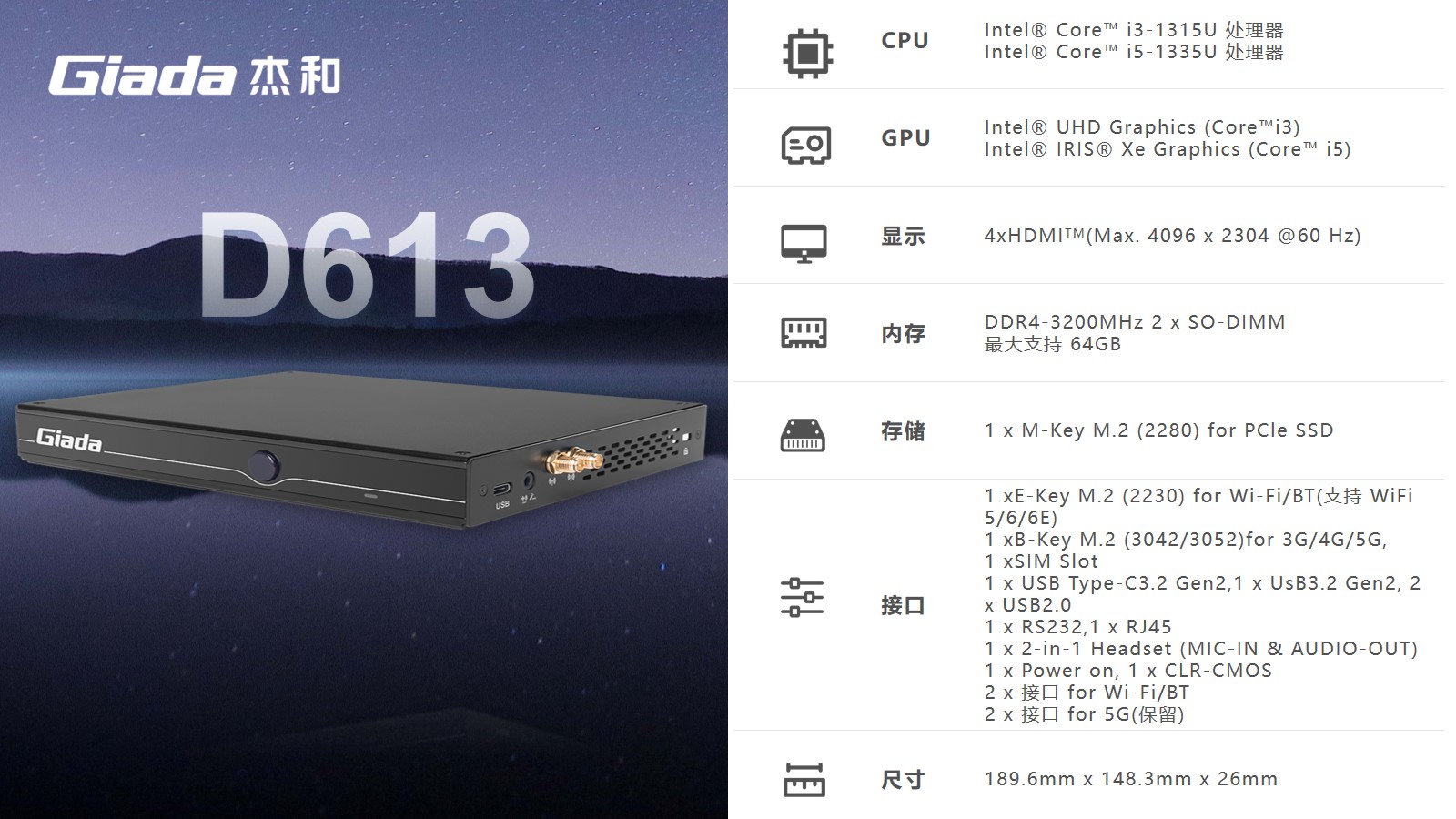 CA88(中国)科技D613可选配Intel®第13代AlderLake i5-1335处理器,作为家用迷你主机来说,足够大的内存容量也可以提升迷你主机的性能表现,更好地支持多任务处理,大型应用程序的运行以及高清视频编辑等任务,拥有的2个SO-DIMM插槽,内存DDR4最大支持64GB的内存容量可以减少系统对硬盘的依赖,提高系统的响应速度。